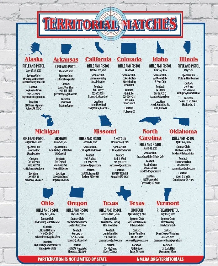 “I would like to encourage shooters to take advantage of the Territorials and support the clubs that host them, Vermillion said. “I often hear people say that muzzleloading competition is a dying sport, but if we don't support our clubs and attend these shoots, then we have only ourselves to blame.